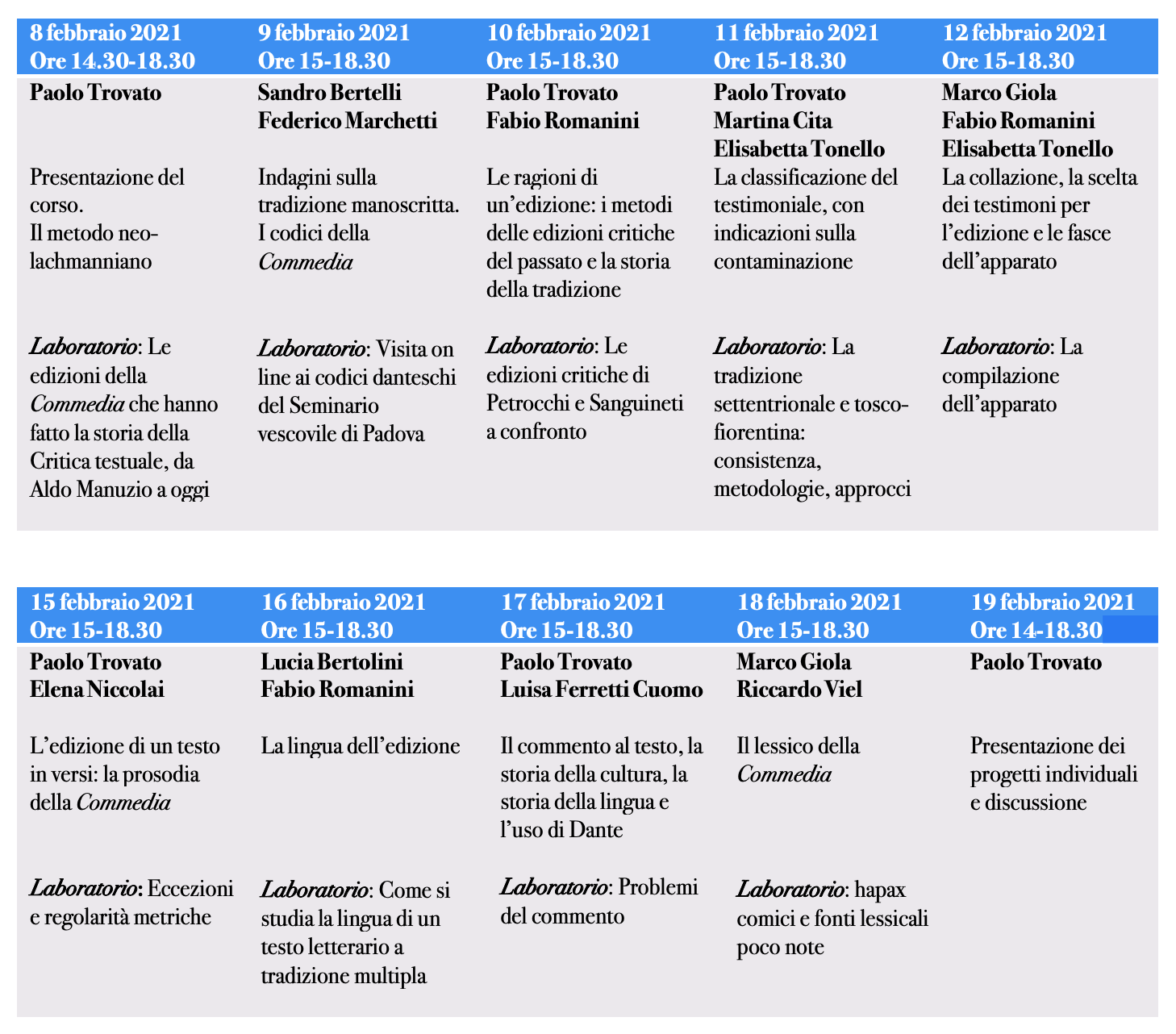 Nelle prime lezioni, gli studenti avranno modo di assimilare e discutere i principi fondativi, così come le più recenti acquisizioni metodologiche del neolachmannismo. Il vero fulcro della Winter School in Dante Studies saranno però le lezioni laboratoriali, condotte dal “gruppo di Ferrara” in collaborazione con esperti di assoluto rilievo. In queste lezioni interattive, i partecipanti potranno confrontarsi attivamente e da vari punti di vista con il testo della Commedia, mettendo in pratica le nozioni acquisite e misurandosi con alcuni dei temi più spinosi di un’edizione critica (la prosodia, la resa linguistica, la ricostruzione testuale, l’esegesi...). Sarà infine dato spazio agli specifici interessi degli studenti, che potranno presentare il proprio progetto di ricerca e discutere con i docenti i passaggi più problematici dei propri studi.
